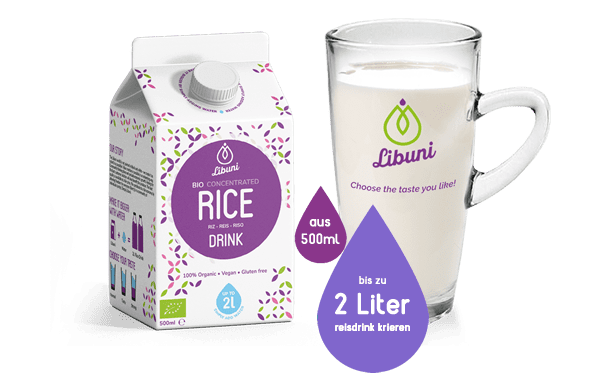 Mische Libuni einfach mit Wasser und kreiere deinen Reisdrink! Aus 500 ml Libuni Reisdrink-Basis kannst du bis zu zwei Liter (2L) Reisdrink in der handelsüblichen Konsistenz kreieren!